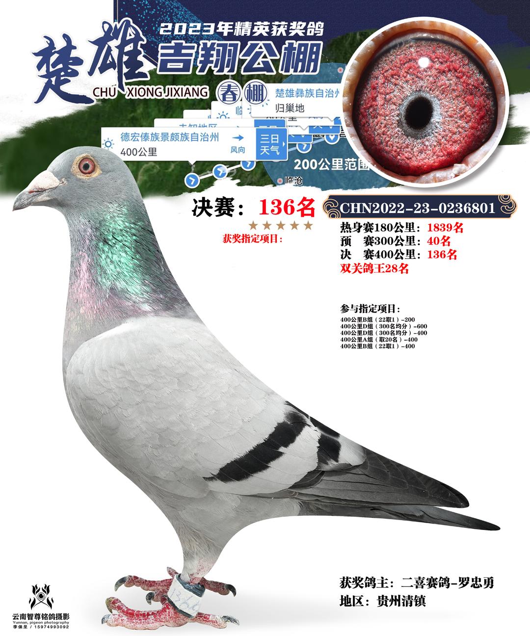 云南楚雄吉翔养殖有限公司(春棚) 2023年(第二届)400公里决赛获奖鸽