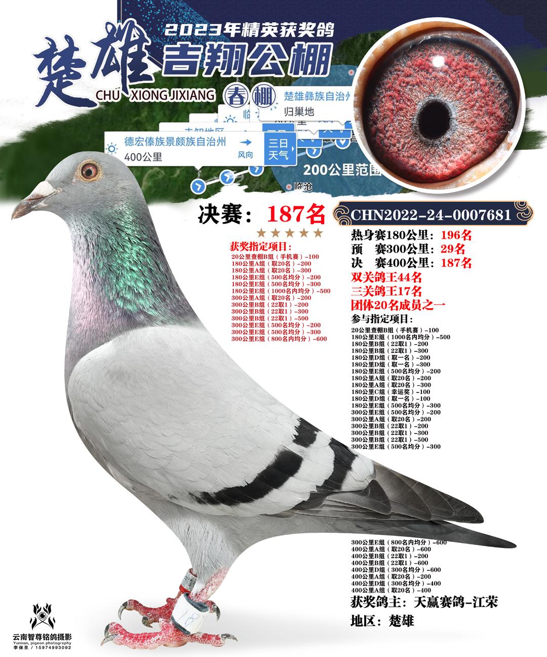 云南楚雄吉翔养殖有限公司(春棚) 2023年(第二届)400公里决赛获奖鸽