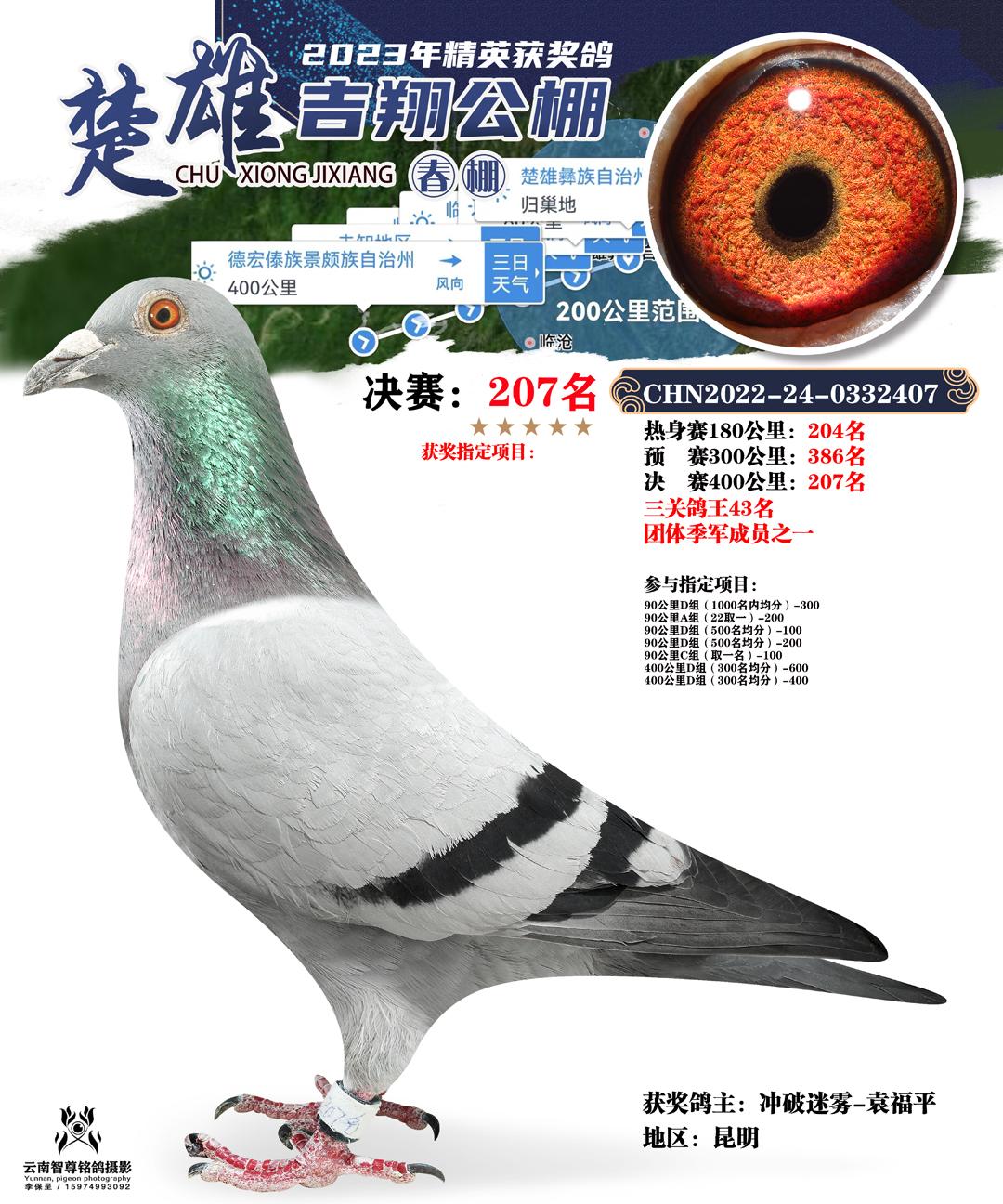 云南楚雄吉翔养殖有限公司(春棚) 2023年(第二届)400公里决赛获奖鸽