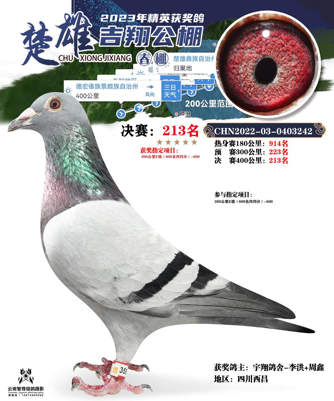 云南楚雄吉翔养殖有限公司(春棚) 2023年(第二届)400公里决赛获奖鸽