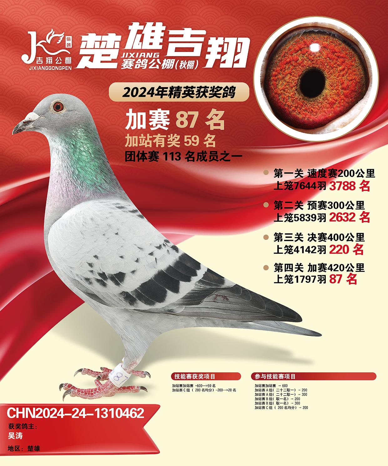 楚雄吉翔养殖有限公司(秋棚)2024年加站赛获奖鸽