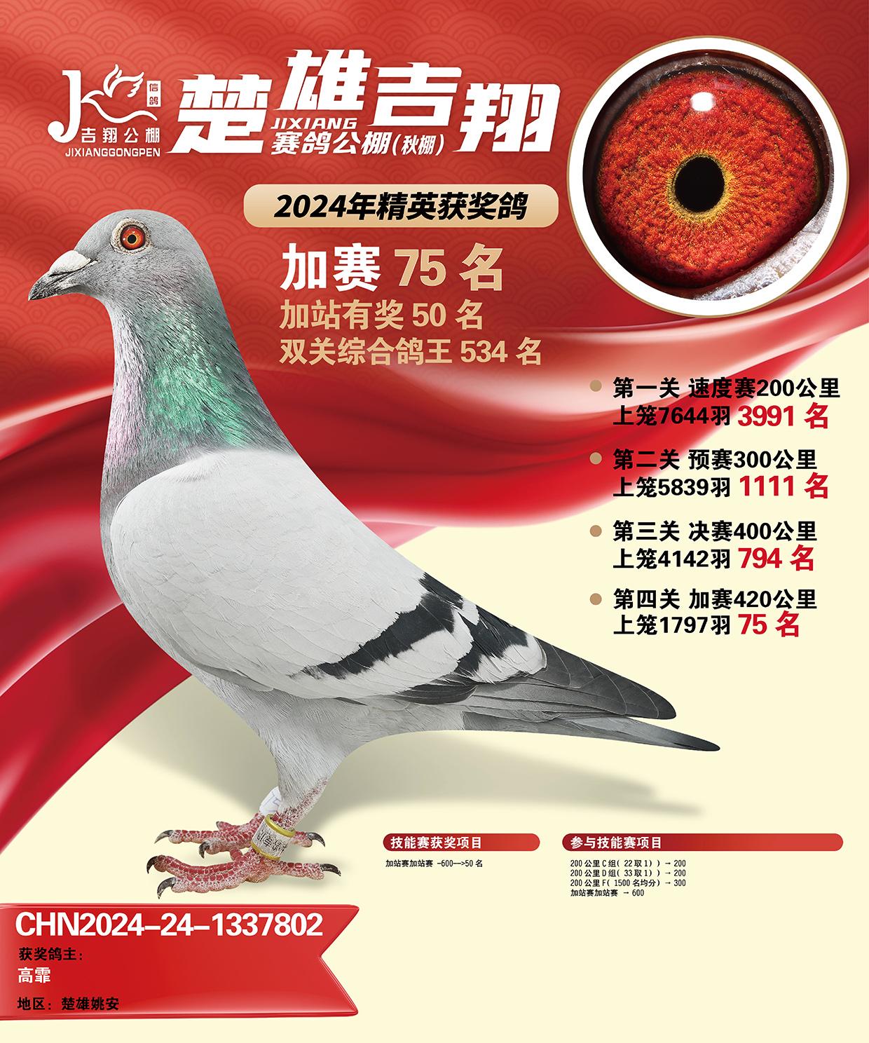 楚雄吉翔养殖有限公司(秋棚)2024年加站赛获奖鸽