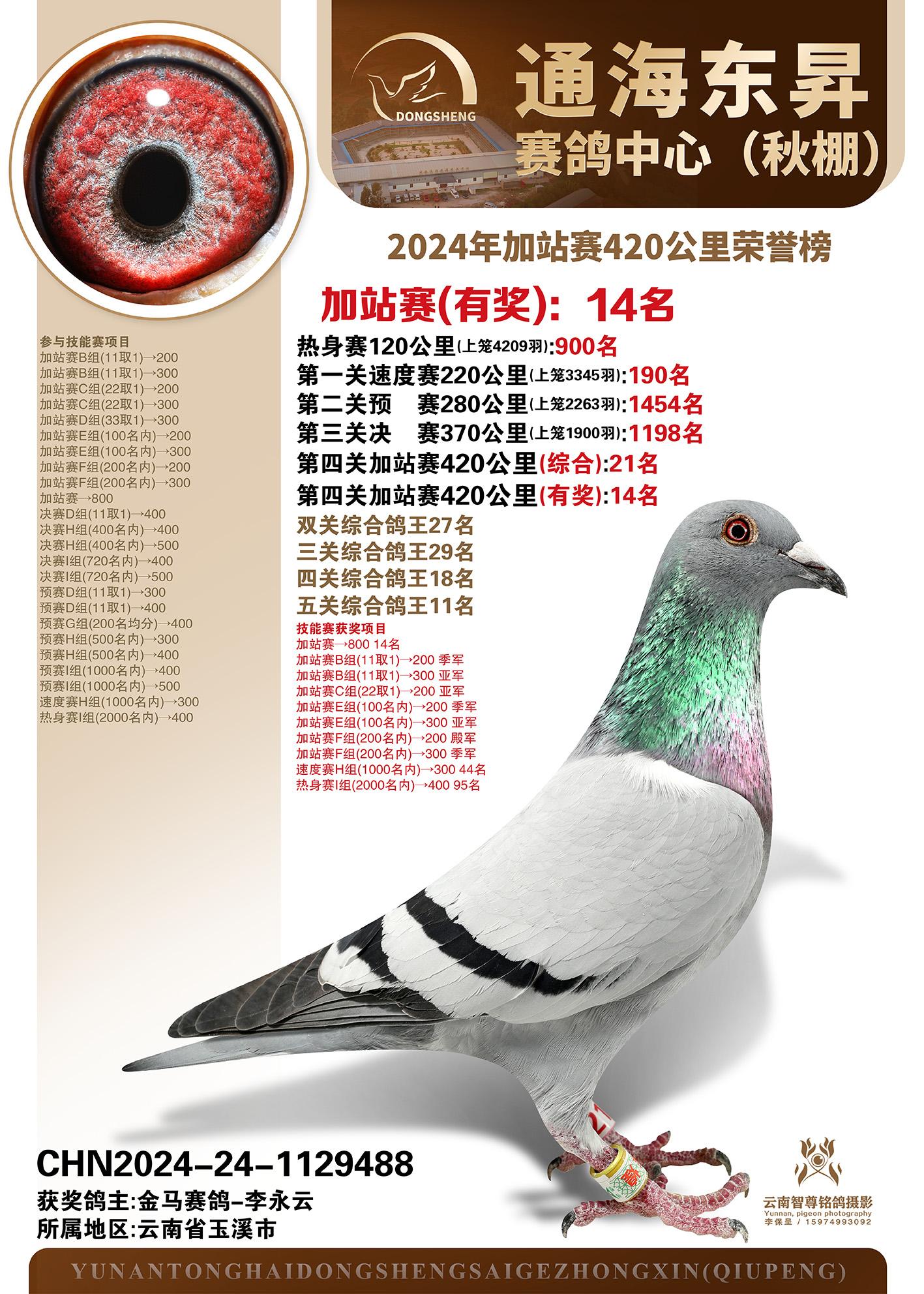 云南通海东昇赛鸽中心2024年加站赛420公里荣誉榜
