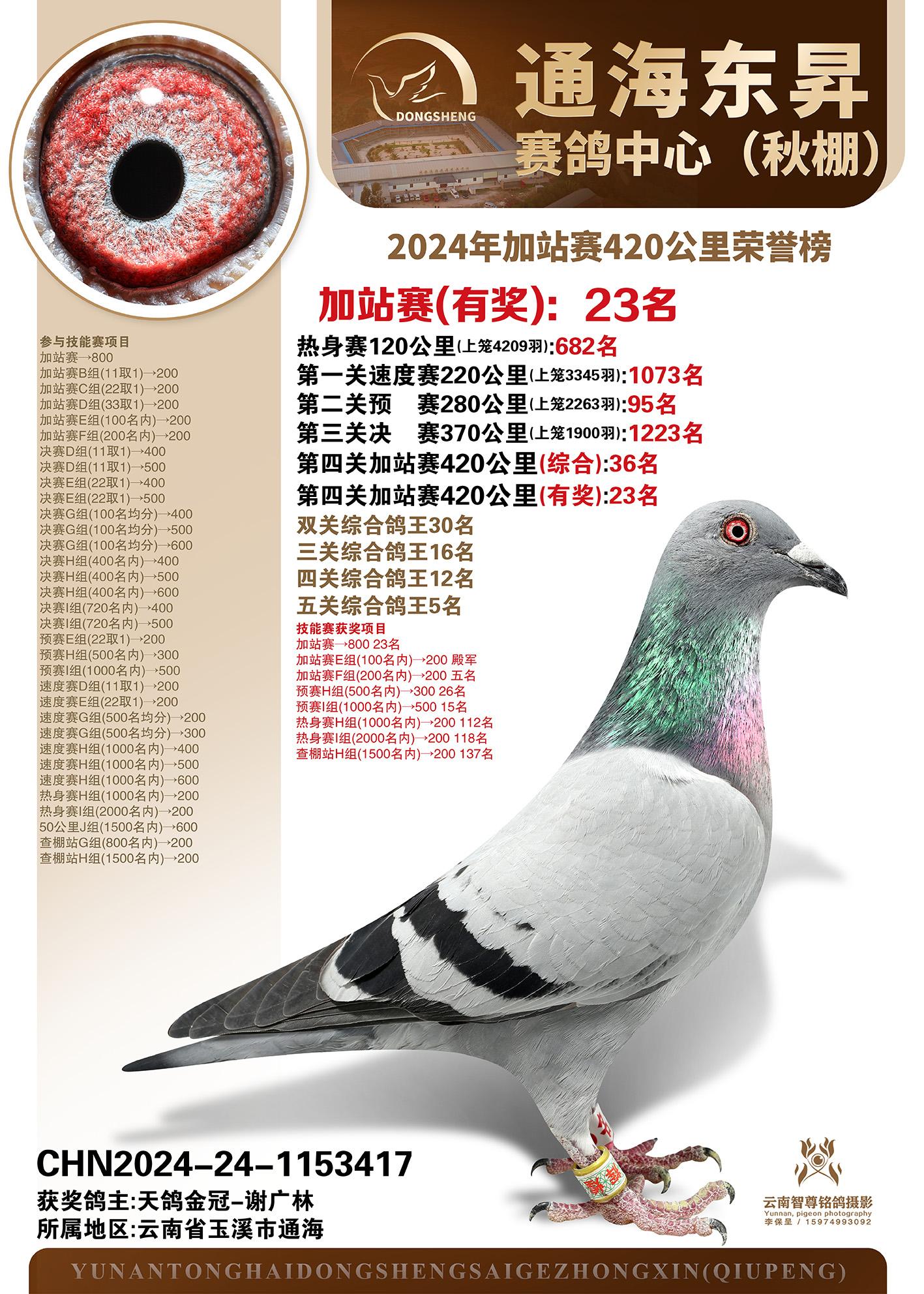 云南通海东昇赛鸽中心2024年加站赛420公里荣誉榜