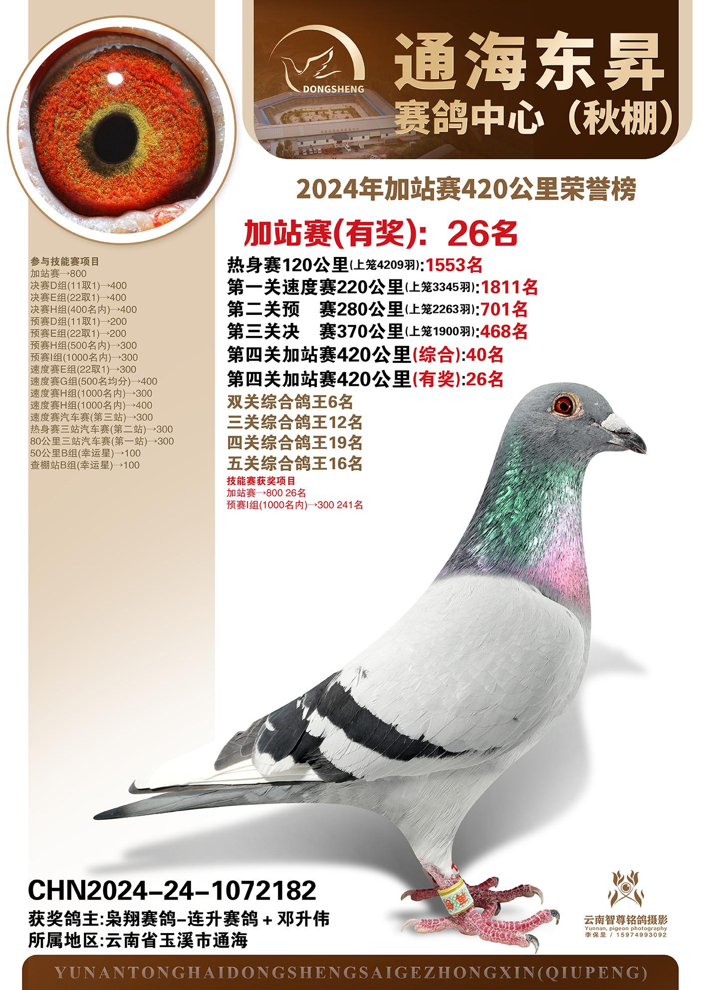 云南通海东昇赛鸽中心2024年加站赛420公里荣誉榜