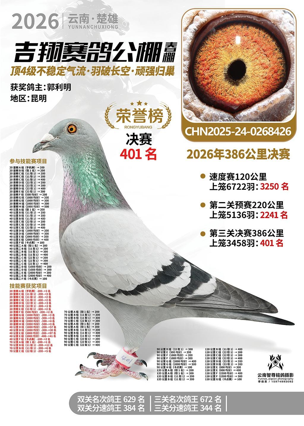楚雄吉翔公棚(春棚)2026年386公里决赛获奖鸽欣赏