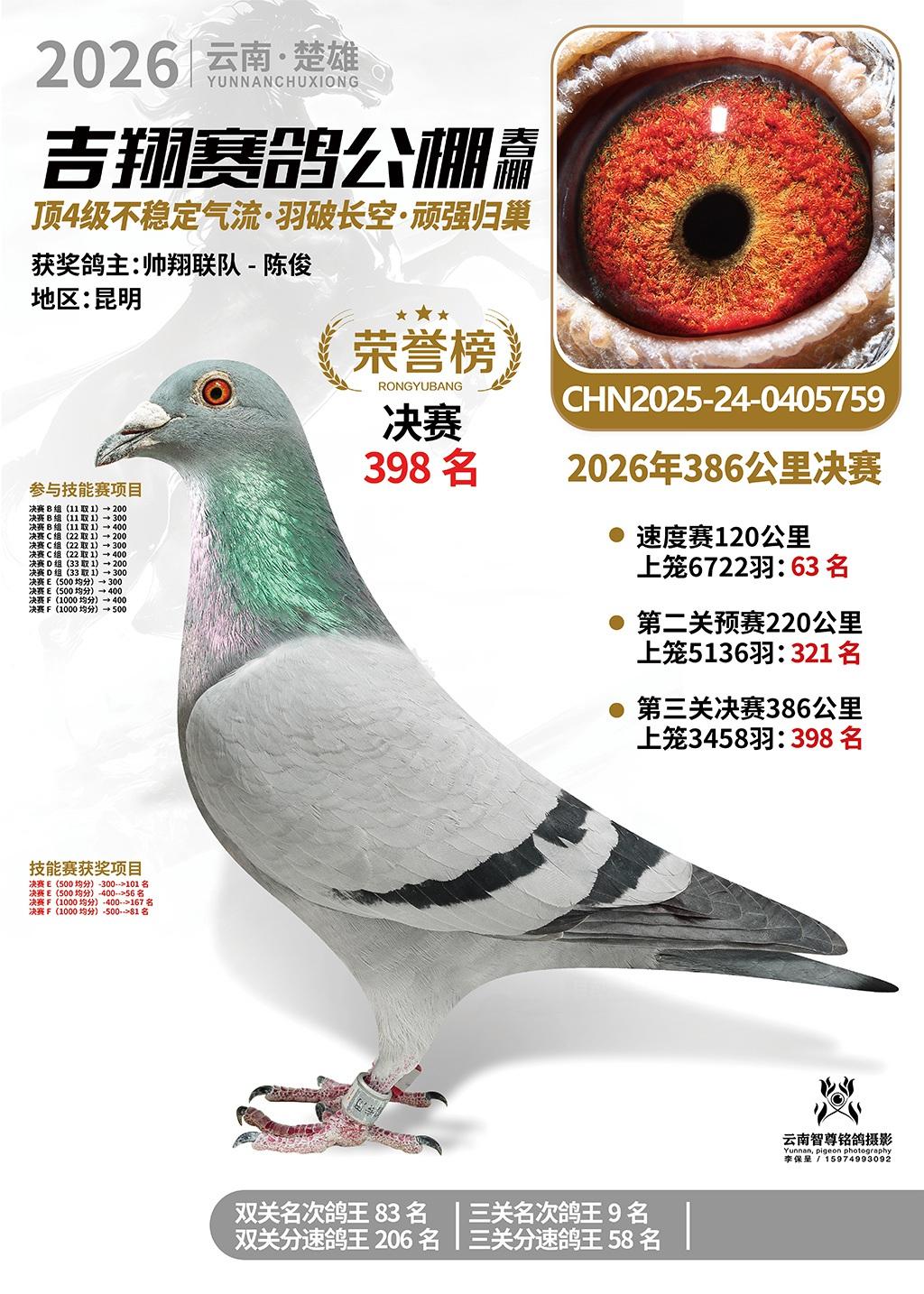 楚雄吉翔公棚(春棚)2026年386公里决赛获奖鸽欣赏