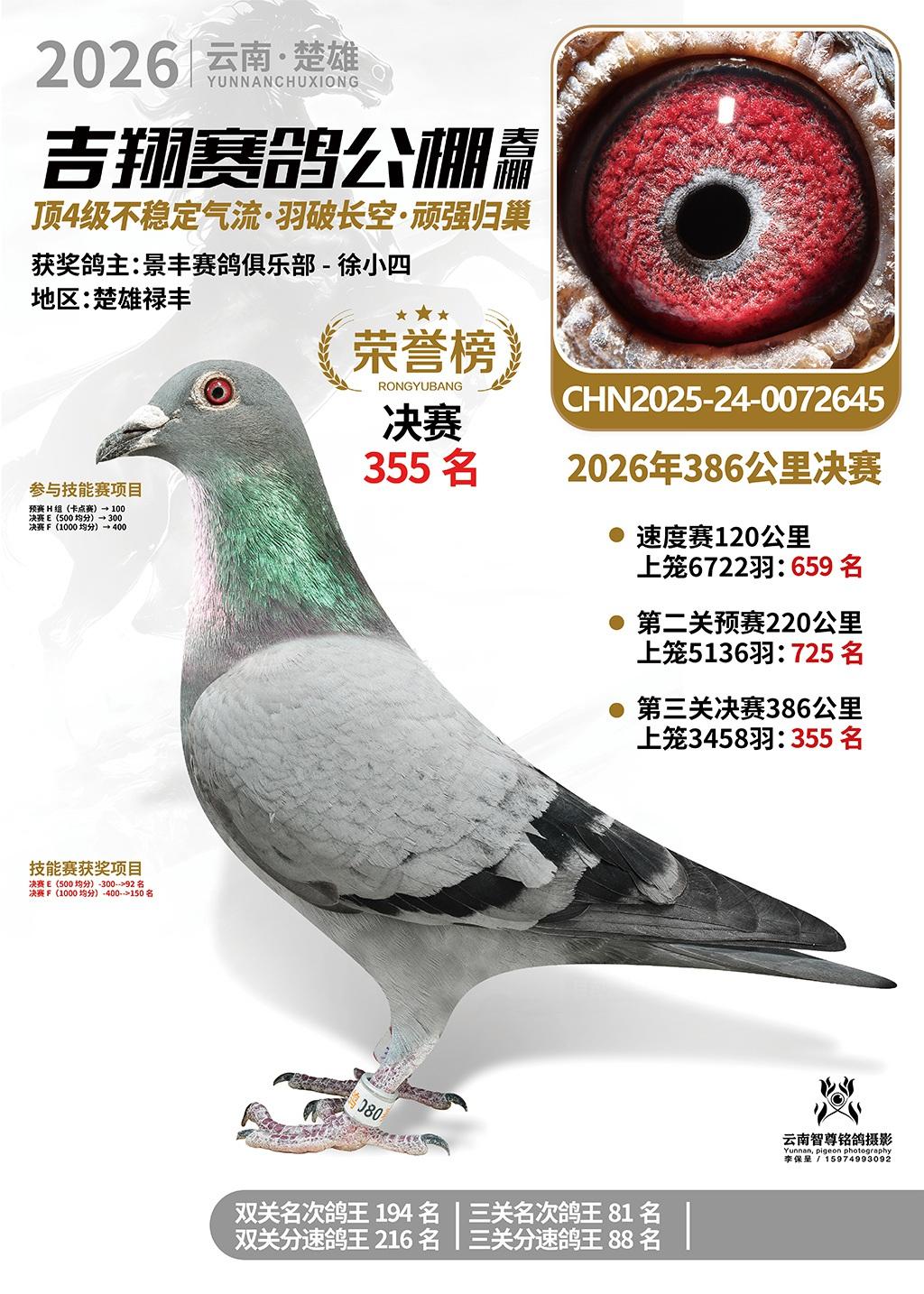 楚雄吉翔公棚(春棚)2026年386公里决赛获奖鸽欣赏