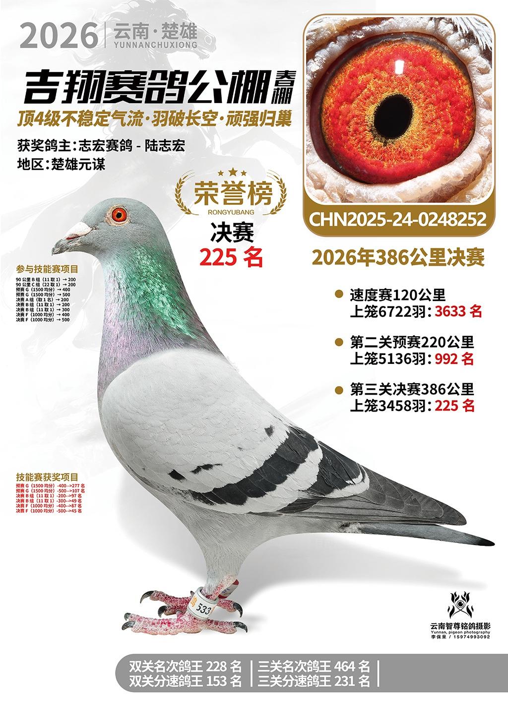 楚雄吉翔公棚(春棚)2026年386公里决赛获奖鸽欣赏