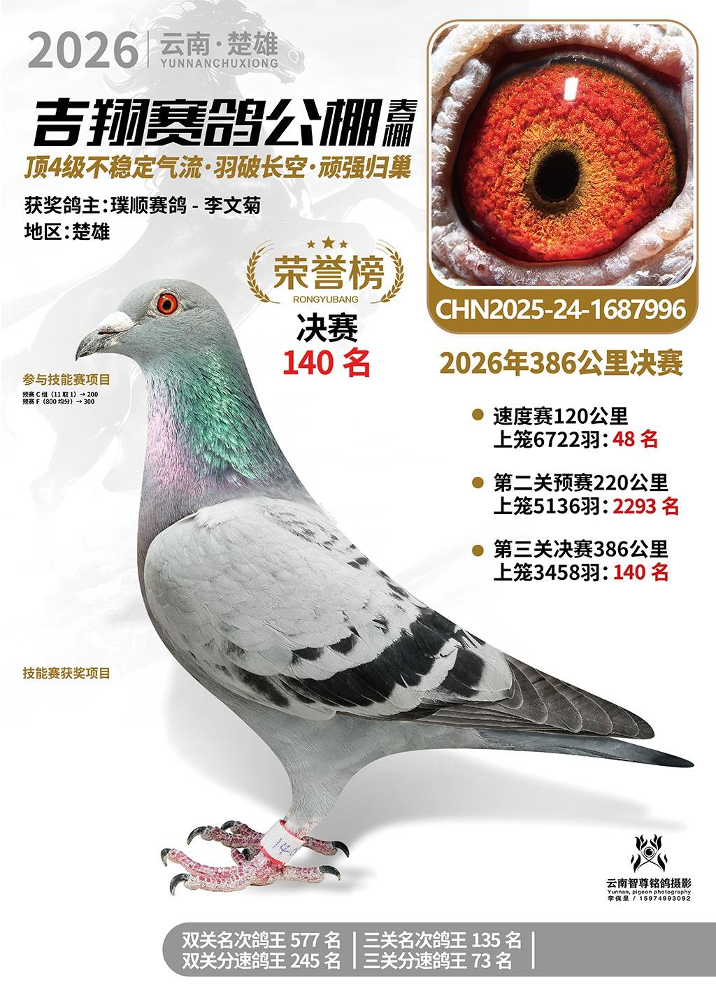 楚雄吉翔公棚(春棚)2026年386公里决赛获奖鸽欣赏