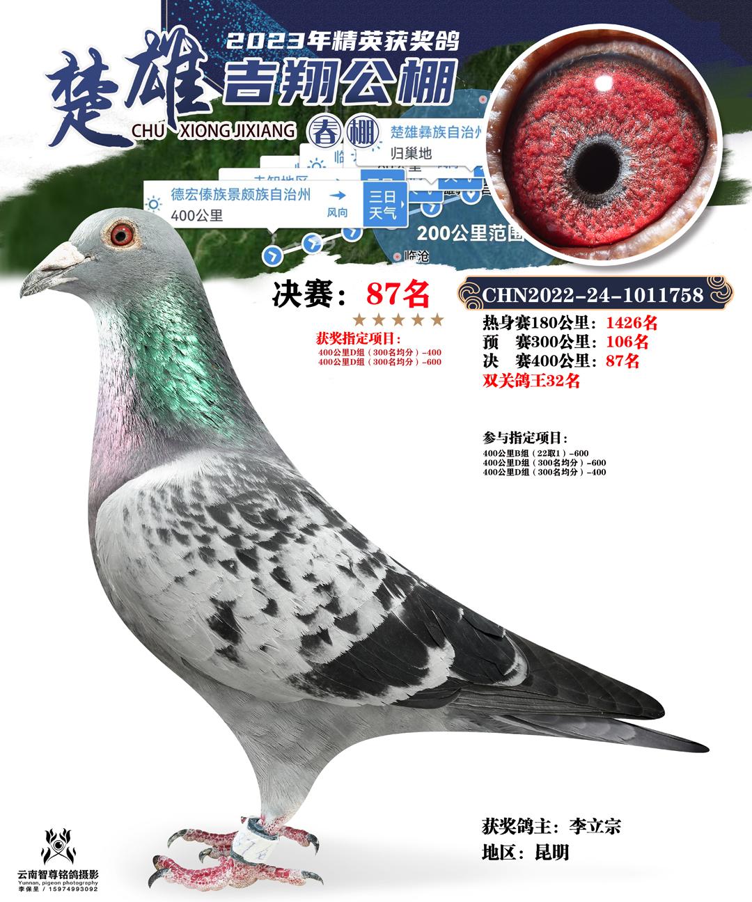 云南楚雄吉翔养殖有限公司(春棚) 2023年(第二届)400公里决赛获奖鸽