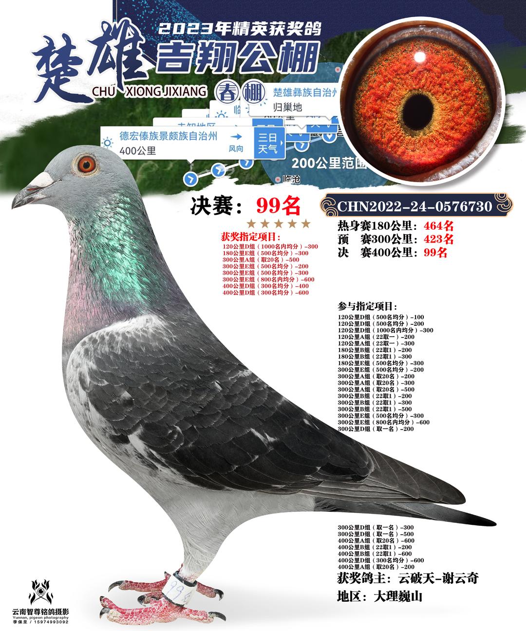 云南楚雄吉翔养殖有限公司(春棚) 2023年(第二届)400公里决赛获奖鸽