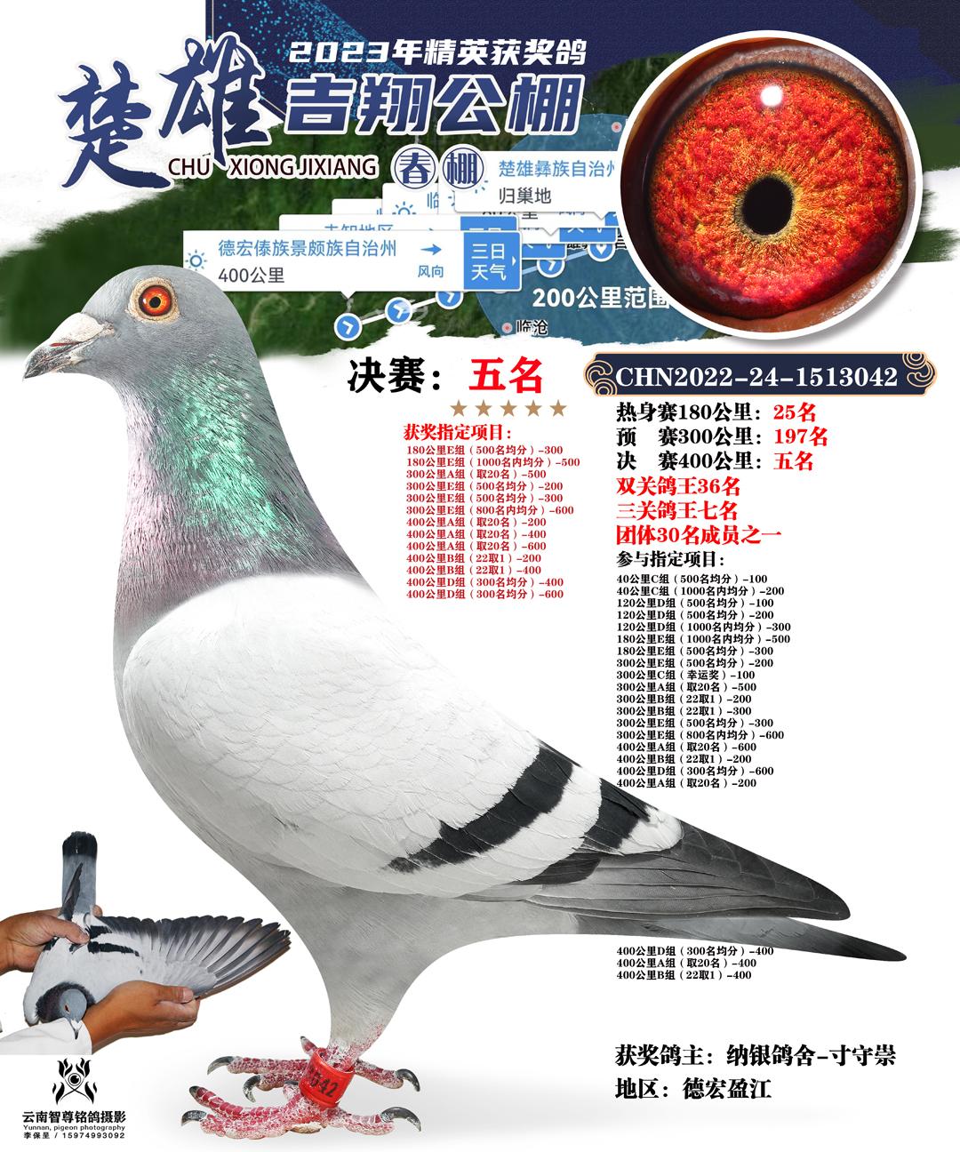 云南楚雄吉翔养殖有限公司(春棚) 2023年(第二届)400公里决赛获奖鸽